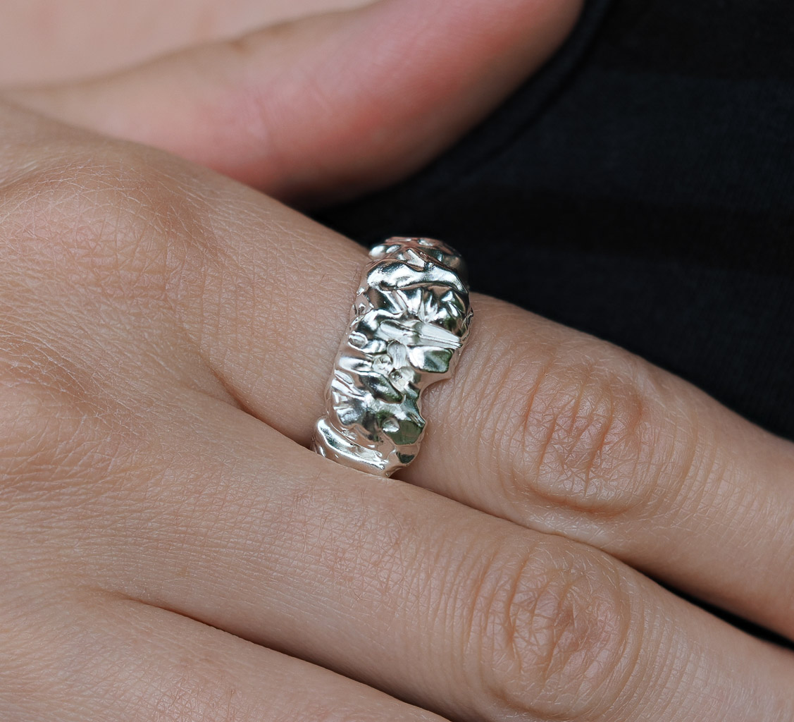 Pour ces créations, je travaille et façonne de la cire, de la matière calcinable ou encore du papier pour ensuite les transformer en métal par le processus de fonte. Chaque pièce est unique, et possède un rendu et une finition qui lui est propre. Cela leur donne un côté rassurant et sensuel au toucher.